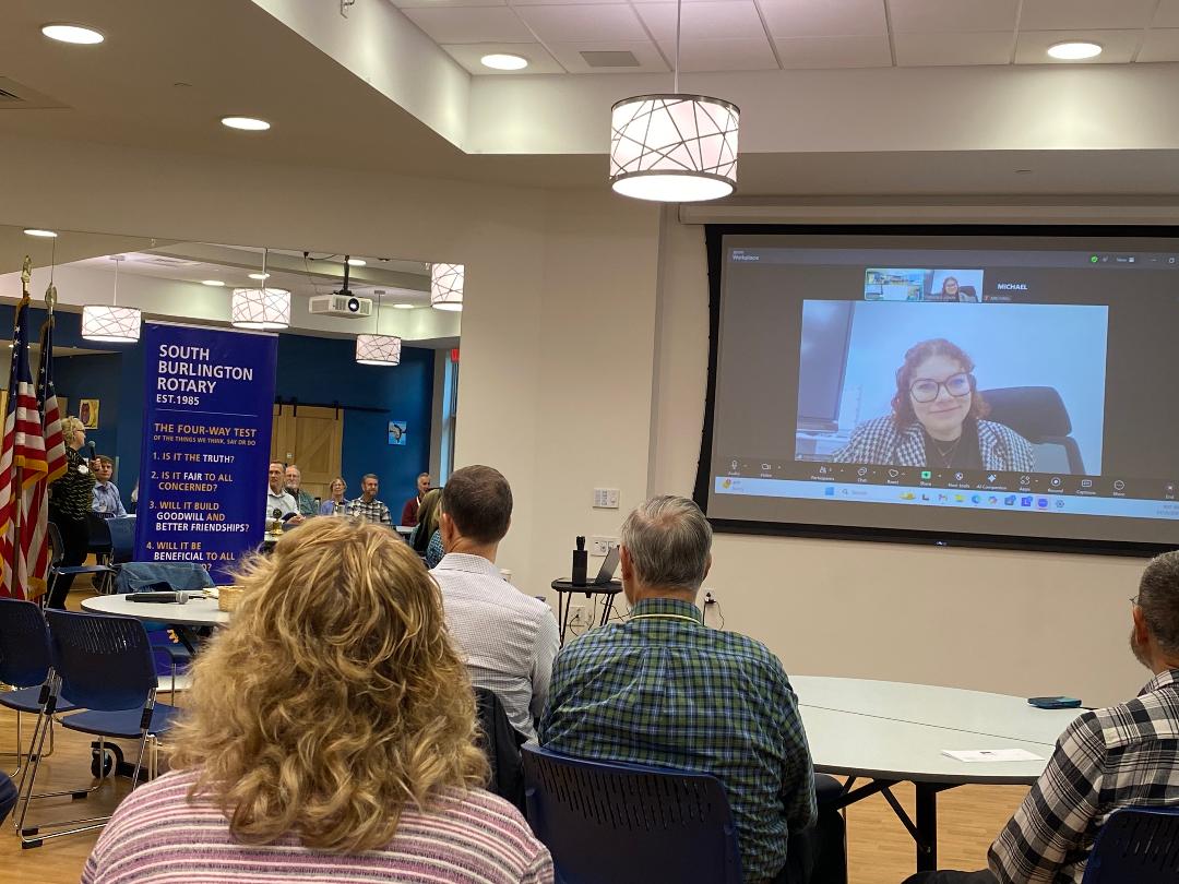 Former SBHS student Florence Libon speaks to the group via Zoom. Florence was a Rotary Youth Exchange scholar 10 years ago.