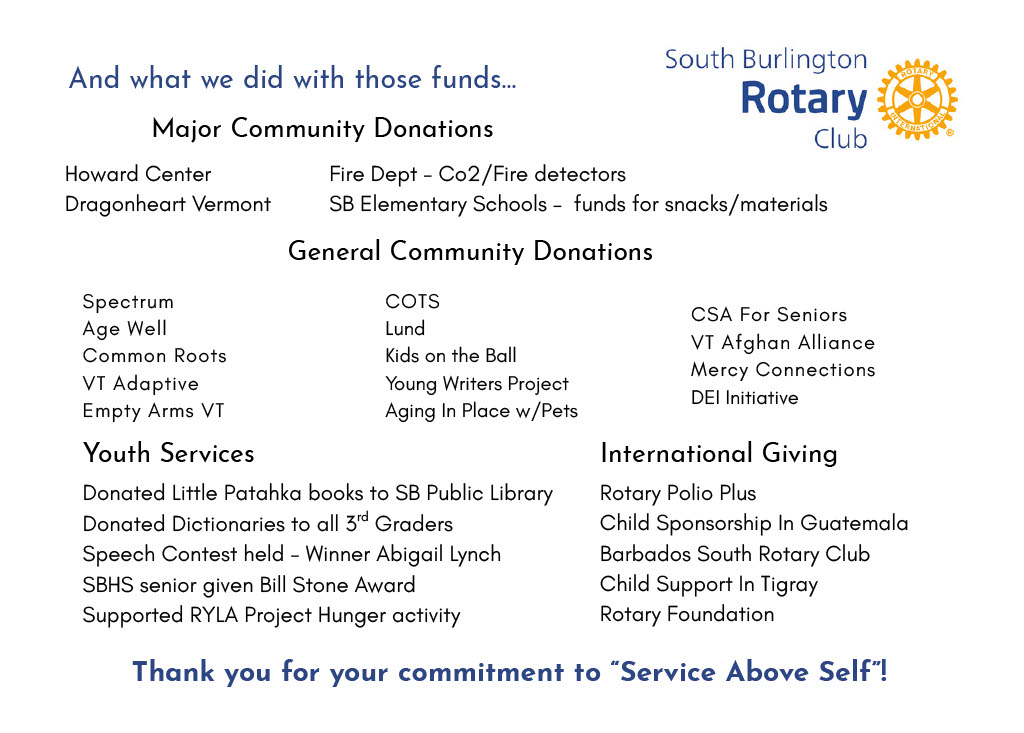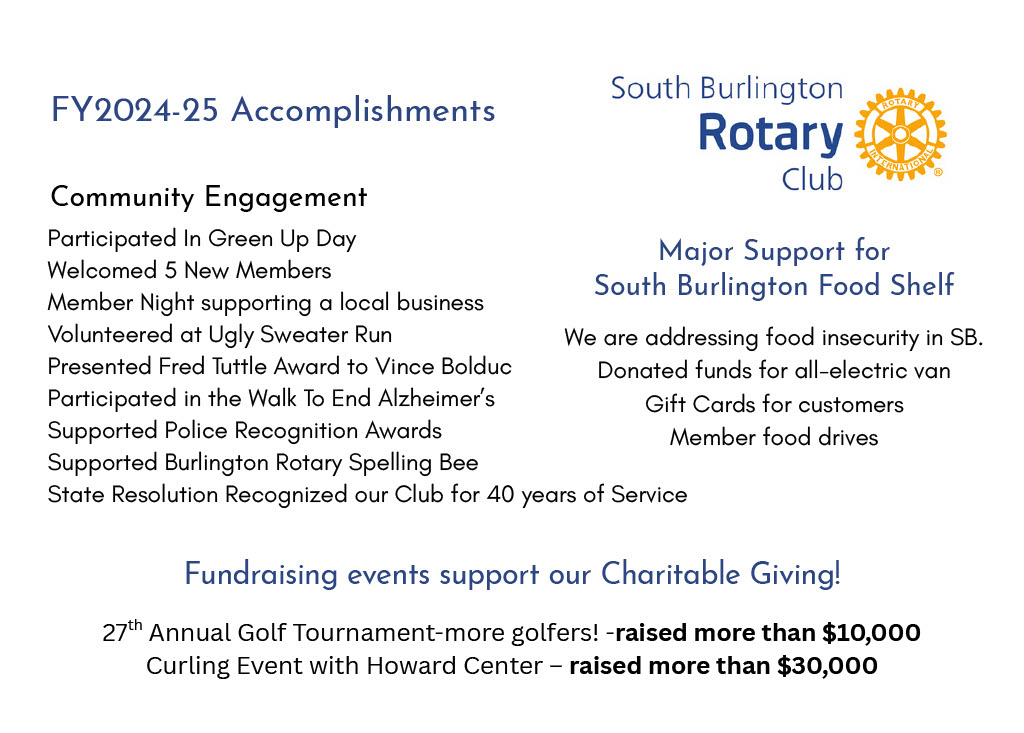 40 Acts for 40 YearsThe South Burlington Rotary Club was founded October 28, 1975 - 40 years ago this year. In celebration of this milestone, the club is dedicated to performing 40 acts of good work, fellowship & learning, and community giving to mark the milestone. Here is a list of good works from October 29, 2024 - October 28, 2025: ![]() ![]() Check out our photo album related to all of these accomplishments.