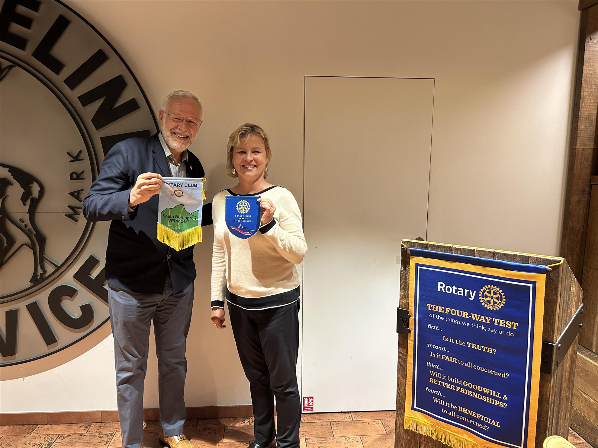 Rotary Flag Exchange With PragueOur member Katarina Khosravi travelled to Prague recently and exchanged our SB flag with one of theirs. Great fellowship! ![]() |